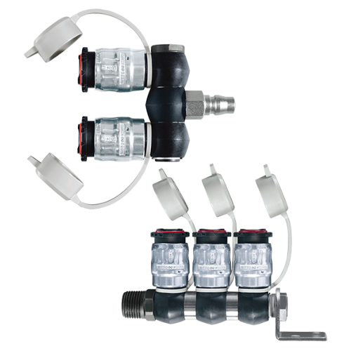 多個(gè)空氣出口可360°自由旋轉(zhuǎn)。低壓損、 大流量的Full-Blow快速接頭的集合配管型。